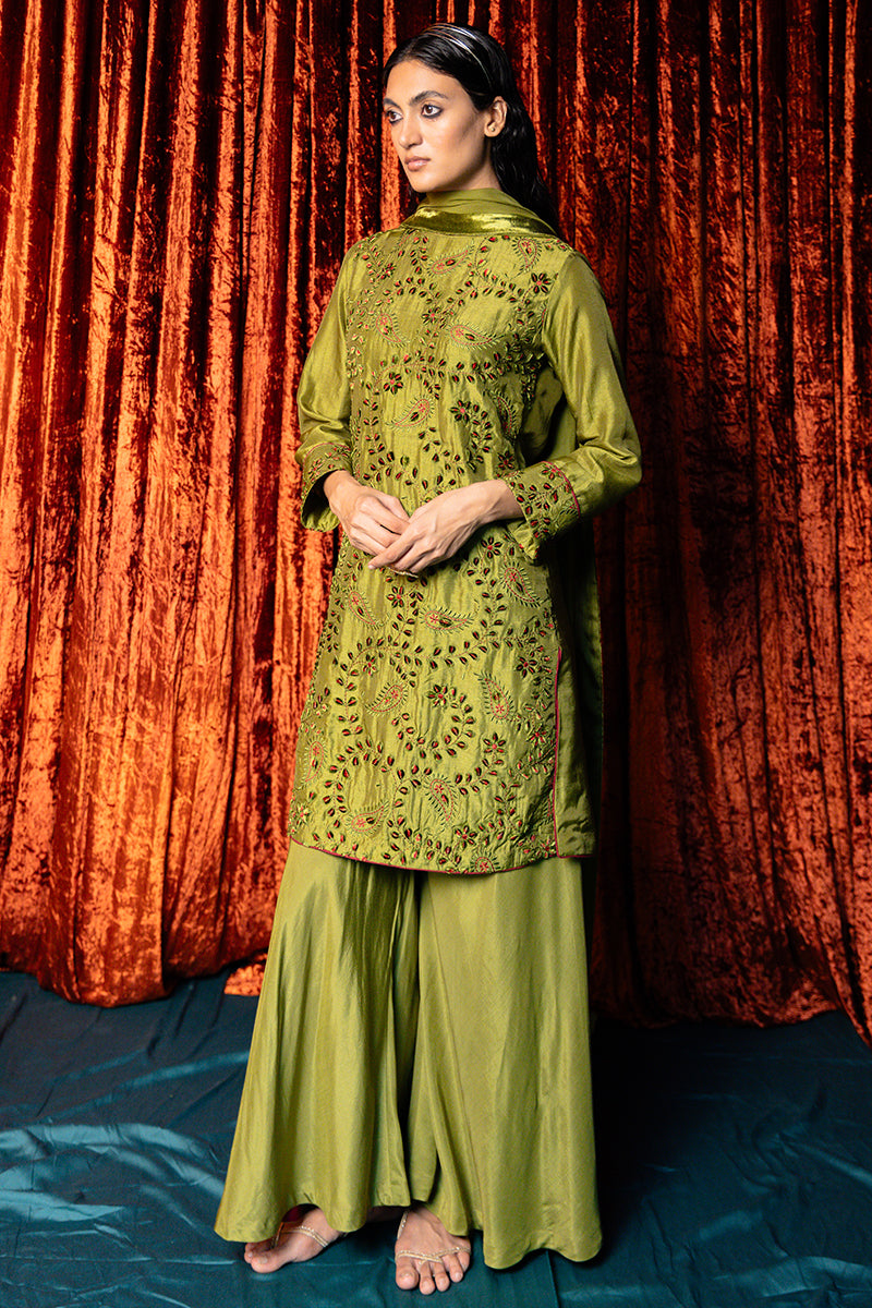 Green Olive Full Embroidered Raw Silk Kurta Set