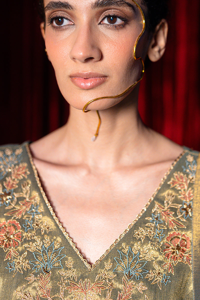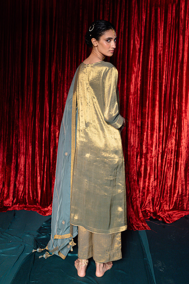 - Vintage gold tissue silk kurta, enhanced with delicate thread