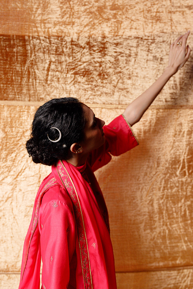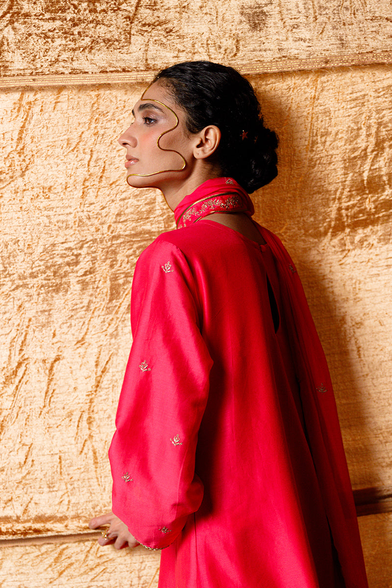 - Zari hand embroidered kurta with detailed organza dupatta.