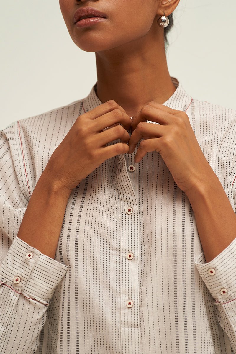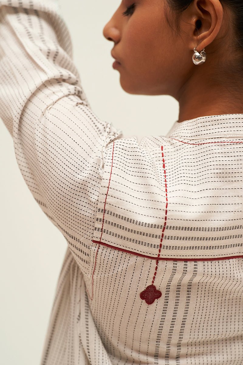 - Top- Kantha style woven pattern on cotton kurta, front opening detail with maroon thread detailing on seam and back of the kurta